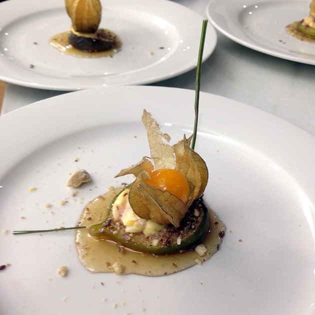 Servir o creme em cima do salmão e finalizar com chia e a fatia de siciliano.