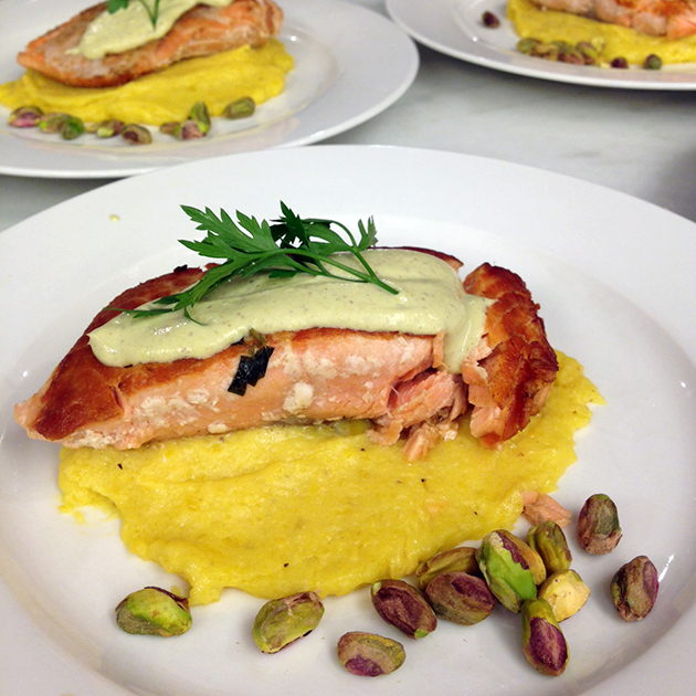 Salmão ao siciliano com creme de pistache e chia