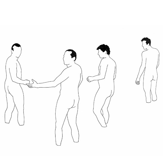 A pesquisa em desenho partiu do desejo de fragilizar os corpos dos homens, reduzir ao máximo, manter apenas a linha essencial que separa o corpo do mundo, que separa o corpo de um outro corpo; a linha limite. Costumo dizer que eu não desenho corpos, desenho fronteiras. A partir do momento que considero que os desenhos das linhas dos corpos são fronteiras, surge a possibilidade de investigar territórios onde esses corpos se inserem. Quando questiono territórios masculinos, quando desenho multidões de homens sem rosto, quando desenho corpos afundados no nada, surge a possibilidade de falar de construções sociais, valores, papéis, condutas, que norteiam a vivência do homem; posso falar de gênero. A masculinidade é um território estreito com muitas regras e qualquer pessoa que não siga as leis desse território é denunciado e punida. A masculinidade tem vocação pra produzir marginais, é só ver a qualidade de notícias sobre crimes homofóbicos nos jornais, a violência contra a mulher diária e incessante, a vida difícil das travestis que abdicaram dos privilégios masculinos pra tomar pra si o universo feminino. A masculinidade é uma mentira que precisa ser destruída, a masculinidade é a maneira que a sociedade criou pra perpetuar poderes onde o homem heterossexual é protagonista da história. O homem é uma linha frágil e simples que só existe porque a gente acredita que existe. O homem precisa ser reinventado pra que haja igualdade.