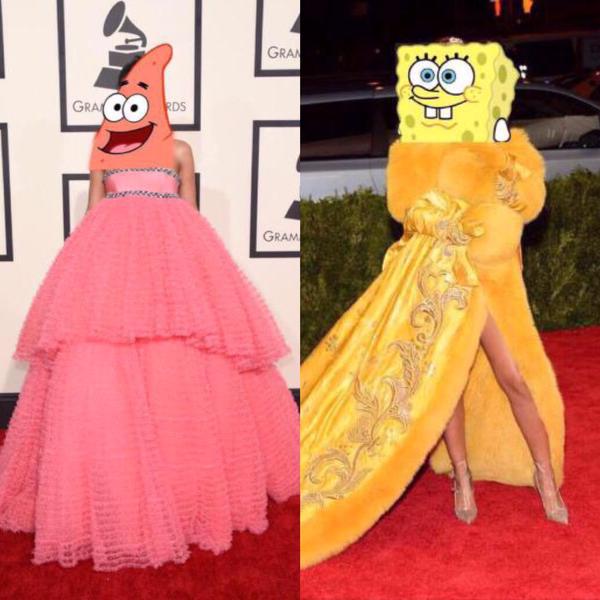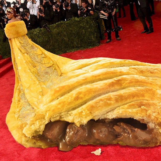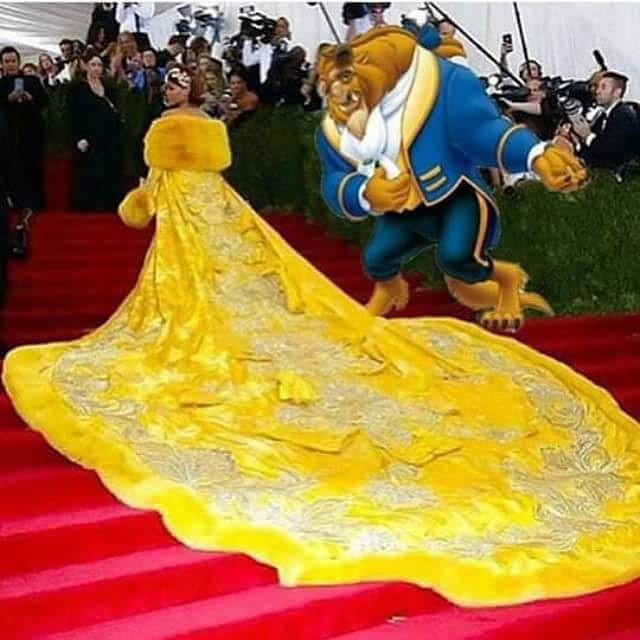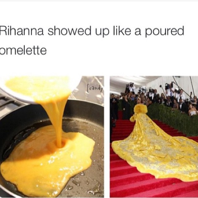 O vestido amarelo usado por Rihanna, desenhado por Guo Pei, na cerimônia do MET Gala, que aconteceu nesta segunda-feira (04.05), em Nova York, virou motivo de piadas na internet.