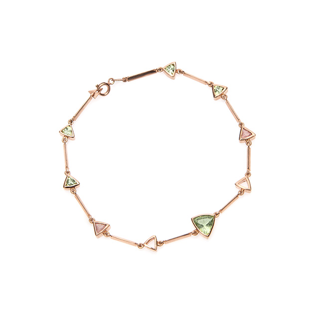 1 / 1Pulseira Caleidoscópio em ouro rosa 18k com peridoto e quartzo rosa – R$5.600 Carol Bassi designer de joiasFoto: Divulgação