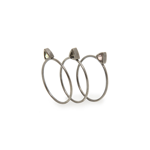 1 / 1Anel Triângulo em ouro branco 18k com ródio negro nas versões com quartzo rosa, peridoto ou vazado. Valor: R$1.350 cadaFoto: Divulgação